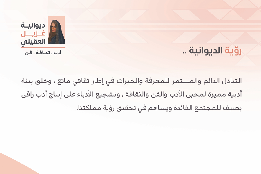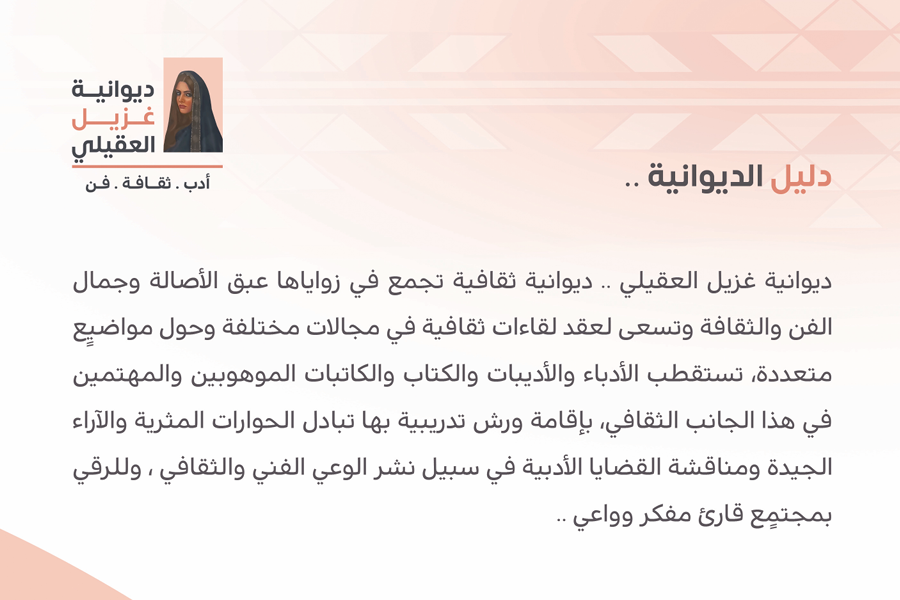 مرحبًا بك في ديوانية غزيل العقيلي، ديوانية ثقافية وأدبية تُعنى بالفن والأدب وتجمع بين الأصالة وروح الإبداع.